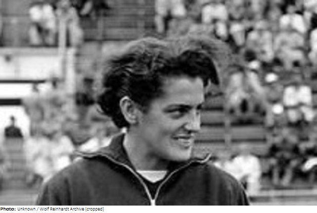 At the 1952 Helsinki Olympics, javelin thrower Marlies Müller came in sixth. She participated in eight international matches and was West German Champion in 1950, 1951 and 1953, runner-up in 1949, and third in 1952. She was later married to non-Olympian high jumper Bernd Naumann, although they divorced. Her brother Hermann-Josef “Olli” Müller was a former sprinter, long jumper and pole vaulter. He was shot down in 1944 as a fighter pilot in Bretagne, France, and was killed in action.