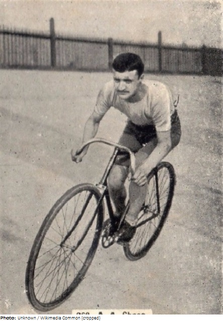 The son of a London builder, Arthur Chase of the North Road CC was a top British track racer in the 1890s and turned professional in his early 20s. He was second in the British 50-mile road championship in 1894, and two years later won the professional motor-paced gold medal at the World Track Championship in Denmark. He beat fellow Briton Jack Stocks into second place, but Stocks got his revenge in the Championships at Glasgow the following year, when Chase took silver. Chase also won the European motor-paced title at Berlin in 1899, and the following year won the 100 km professional race at the Paris Olympics. Throughout his career, he set world and UK records at distances ranging from half-mile to 50 miles. In 1902 Chase was the subject of the silent movie “A. A. Chase, the Champion Cyclist”. After his racing days, he went into partnership with his younger brother Frederick, manufacturing motor cycles. In 1937 Arthur was granted a patent for a silencer for the combustion engine.