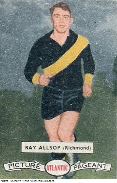 Australian rules footballer Ray Allsopp played in 54 matches for Richmond Football Club in the Victorian Football League (VFL) from 1955 to 1959 where he scored 69 goals. In the same period Allsopp also played in 21 reserve games and represented Victoria on three occasions during their tour of South and Western Australia in 1957. Aussie rules football was a demonstration sport at the 1956 Melbourne Olympics, contested by two amateur sides from Victoria. Allsopp represented the Victorian Football League side that lost 81–55 to the Victorian Amateur Football Association team. After his playing career he became the VFL’s first full-time administrator, going on to develop a junior football programme. Allsopp was awarded with the Medal of the Order of Australia in 2017 for his service to the sport.