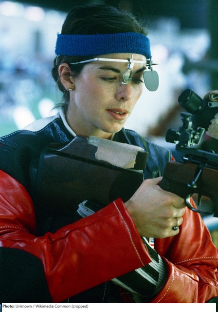 Gloria Parmentier was a shooting prodigy, winning the 1974 US women’s smallbore rifle 3-position title when she was only 16-years-old. The next year she made the Pan American Games team and won a gold medal in team air rifle. Parmentier attended East Tennessee State University where she was a four-time All-American in rifle shooting. In 1980 she joined the US Army, graduating from the Air Defense Artillery (Nike Hercules) Officer Basic School and the Airborne School and was assigned to the USAMU International Rifle Section in February 1981.