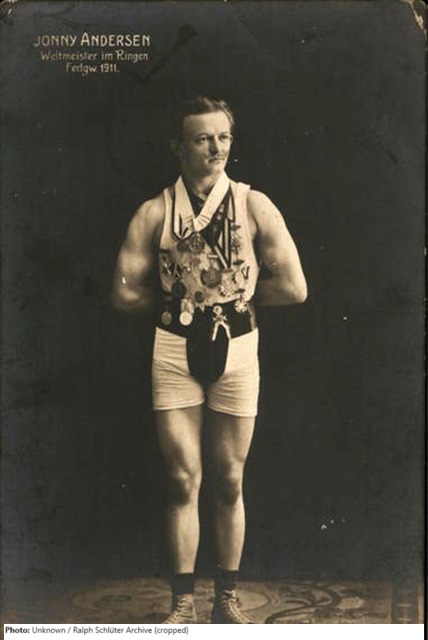 German wrestler Georg “Jonny” Anderson of Hamburg finished sixth at the 1910 World Greco-Roman Championship in featherweight. One year later he came second at the 1911 Unofficial World Championships in Dresden. He was also 1921 European Champion in the same class. At the 1912 Stockholm Olympics Andersen was eliminated in the second round against Hungarian József Pongrácz.