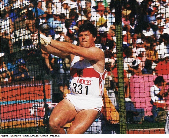 During the 1970s and 1980s Karl-Hans Riehm was among the world’s best hammer throwers. He earned a silver medal at the 1984 Los Angeles Olympics and finished 10th in 1972 and fourth in 1976. Riehm would have been one of the favorites in 1980, but due to the US-led boycott could not start in Moskva. In 1983, he placed seventh at the World Championships. Riehm won the World Cup in 1977 and was runner-up in 1979 and 1981. He won bronze at the 1978 European Championships, also winning European Cups in 1975, 1977, and 1979, and was runner-up in 1981. Domestically he won 10 West German titles in 1973, 1975-81, and 1983-84. During and after his athletics career he competed at table tennis.