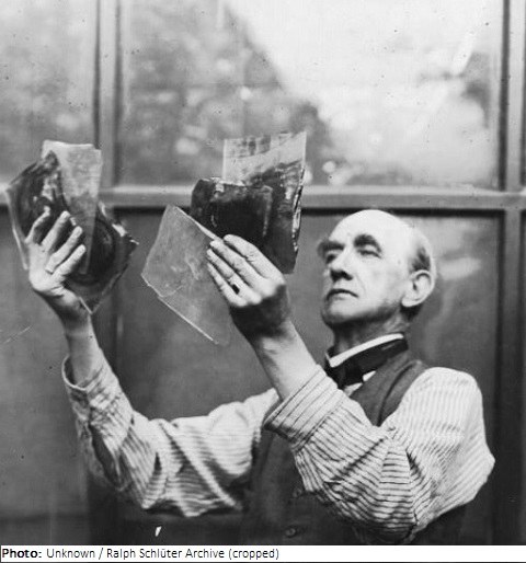 British painter and glass artist Leonard Walker was educated at King Edward’s School in Bromsgrove and studied at the St. John’s Wood Art School in London where he began to produce stained glass in the 1890s. He used slab glass extensively in his works. This is made by blowing semi-molten glass into a rectangular bottle mold. Its uneven thickness gives a lustrous effect and many subtle color variations. Walker exploited these qualities in the glass in the execution of his designs. He made the glass himself.